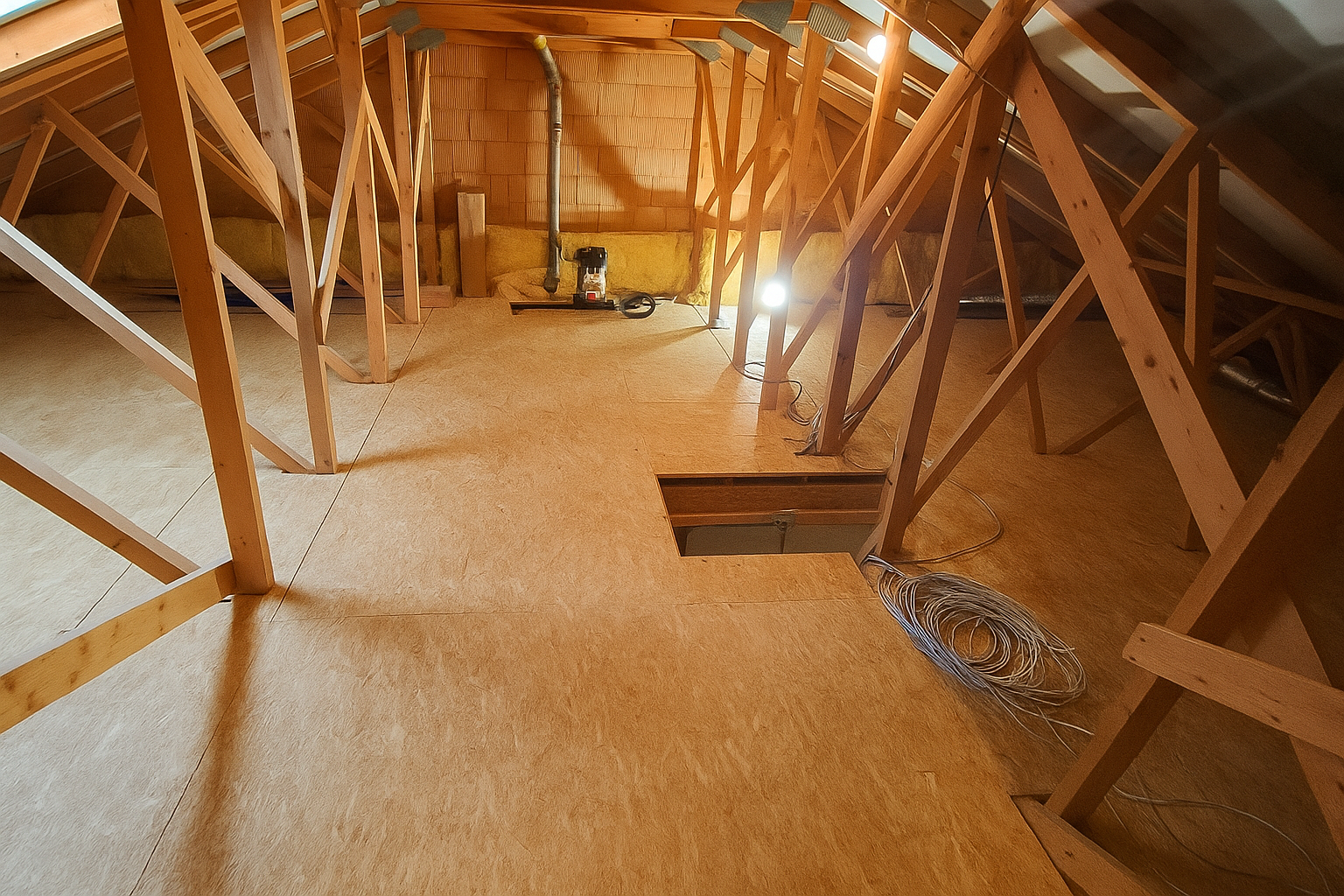 půdě z dřevotřískových desek. Prostor byl velmi nízký, takže práce byla náročná – nebylo možné se zde plně postavit. Přesto jsme dokázali vyhovět všem požadavkům klienta a vytvořit pevnou a praktickou plochu, která maximálně využívá dostupný prostor pod střechou.