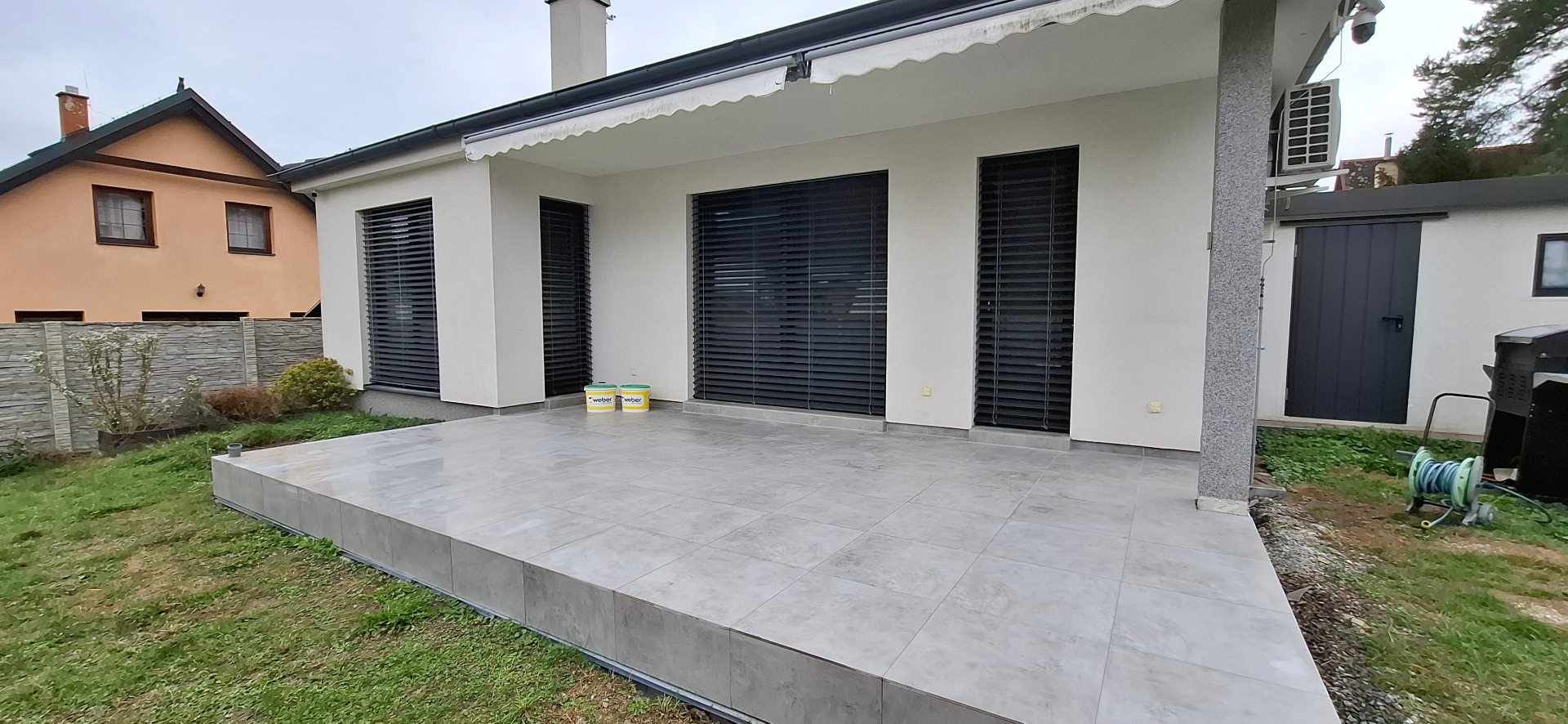 Na této fotografii je zachycena dokončená terasa u rodinného domu po provedení stavebních prací. Původní podklad byl upraven, vyrovnán a následně položena nová dlažba s důrazem na přesnost spár a kvalitu detailů napojení na fasádu. Terasa nyní tvoří estetické i funkční propojení interiéru s exteriérem a poskytuje příjemný prostor pro odpočinek či posezení s rodinou.